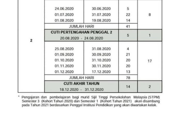 Penggal persekolahan akan bermula pada 20 januari tahun depan seperti mana dimaklumkan kementerian pendidikan sebelum ini. Menurut pengumuman oleh menteri pendidikan, tarikh pembukaan rasmi bagi sesi persekolahan tahun 2021. Kalender pendidikan 2020 dan 2021.